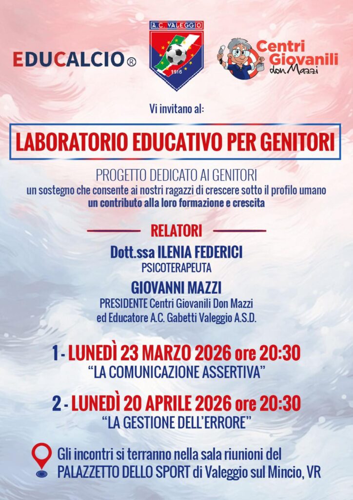 Valeggio sul Mincio – Lunedì 20 aprile, alle ore 20.30 si terrà il secondo ed ultimo appuntamento di “Laboratorio educativo per genitori” sulla gestione dell’errore presso la sala riunioni del Palazzetto dello Sport di Valeggio sul Mincio.